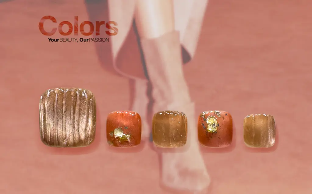 This design features the “Baccarat Nail,” creating dimension by layering light. A delicate brown gradient is topped with gold, expressing a glass-like depth. The shine, which changes with the angle, adds warmth and elegant glamour to your feet.